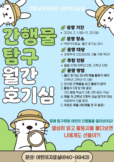 [파이낸셜경제=조성환 기자] 강릉교육문화관(관장 박기현)은 2026년 2월부터 11월까지 초등학생을 대상으로 간행물 탐구 ‘월간 호기심’을 운영한다.
