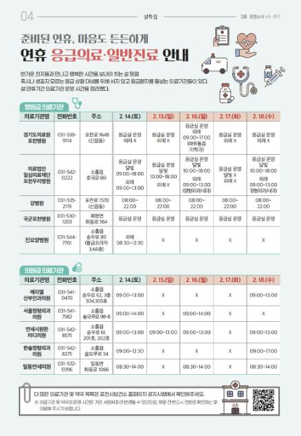연휴 기간 진료가 가능한 병의원과 약국 정보는 포천시보건소 누리집과 공식 누리소통망(SNS)을 통해 확인할 수 있으며, 응급의료정보제공 앱과 응급똑똑 앱을 통해서도 실시간 조회가 가능하다. 이와 함께 119 구급상황관리센터와 129 보건복지콜센터를 통해서도 관련 안내를 받을 수 있다.
