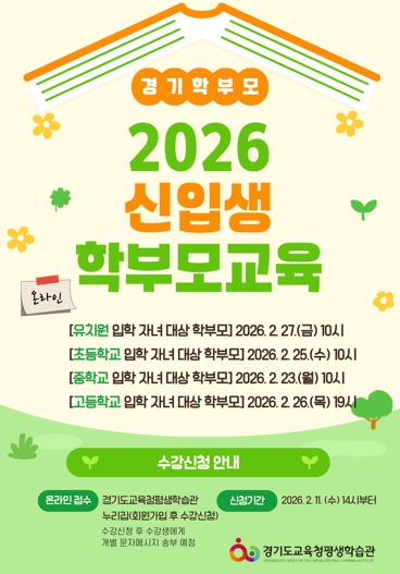 류영신 경기도교육청평생학습관장은 “2025년 지역과 학교로 찾아가는 학부모교육과 온라인 교육에 약 7만 5천여 명의 학부모님이 함께했다”며 “2026년에도 경기교육정책에 기반하여 학생ㆍ학부모 수요 맞춤형 프로그램을 적극적으로 추진하겠다”고 말했다.