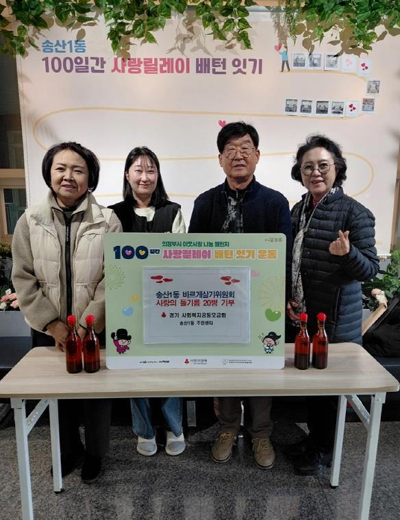 [파이낸셜경제=김기보 기자] 의정부시 송산1동주민센터는 11월 19일 송산1동 바르게살기위원회가 직접 만든 들기름 20병을 기부하며 ‘100일간 사랑릴레이 배턴 잇기’에 동참했다고 밝혔다.