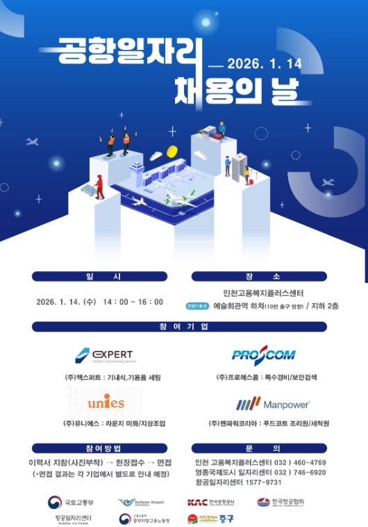 중구 관계자는 “2026년 첫 진행되는 이번 행사가 항공산업 분야 기업의 구인난 해소와 지역 일자리 창출에 도움이 되길 바란다”라며 “구직자들의 적극적인 관심과 참여를 바란다”라고 밝혔다.