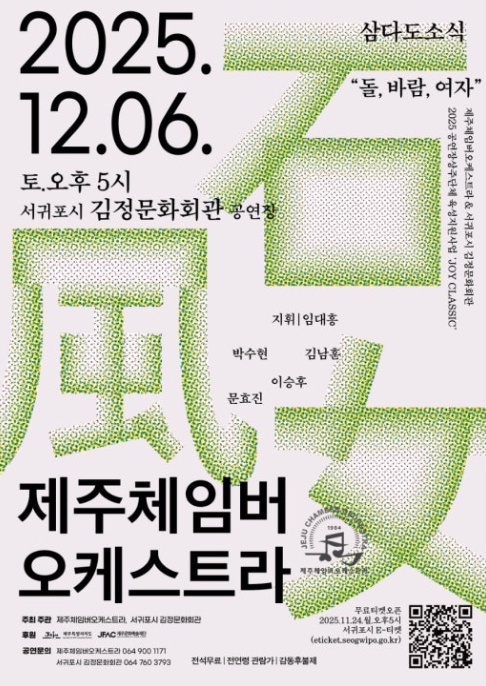 작곡가 박수현의 '제주의 돌 · 바람 · 여자'를 비롯해 이승후의 '제주도의 사계 중 '겨울'', 김남훈의 '삼다도 소식'과 '제주도의 푸른 밤', 문효진의 '오돌또기+느영나영' 등 제주정서를 담은 다채로운 작품들이 제주체임버오케스트라의 연주로 선보이며, 제주 고유의 문화와 감성을 음악으로 재해석하는 특별한 무대를 선사할 예정이다.