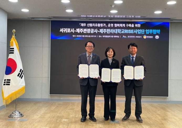 [파이낸셜경제=김영란 기자] 서귀포시는 20일 제주관광공사, 제주한라대학교 RISE사업단과 함께 ‘제주 산림치유활동가 운영 협력체계 구축을 위한 업무협약’을 체결했다고 밝혔다.