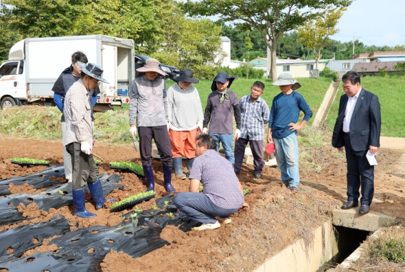 | ▲ 7일 진행한 귀농인의 집 배추 정식 실습 교육 중 김산 군수가 방문해 교육생들을 격려했다. |