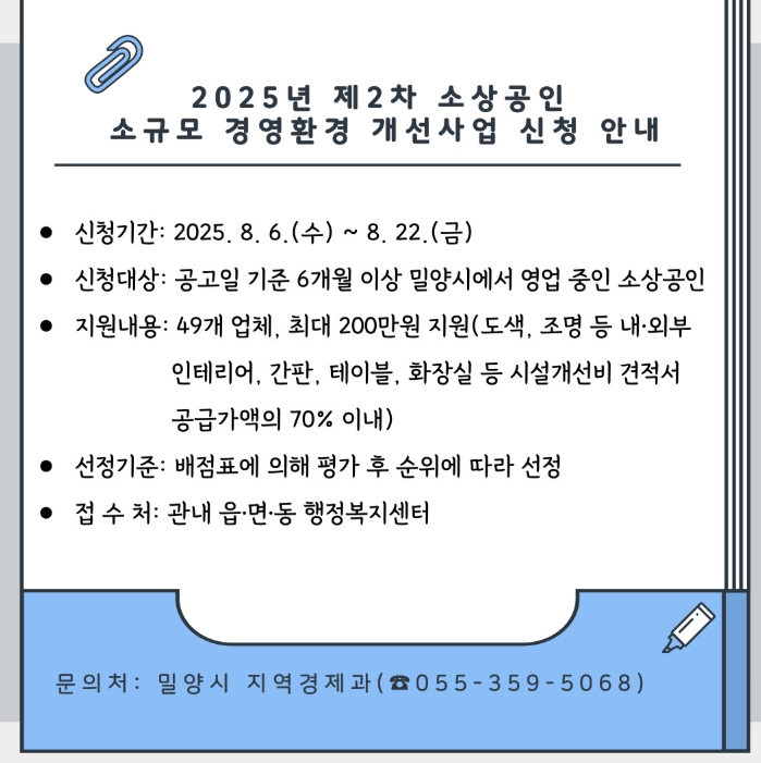 [파이낸셜경제=김예빈 기자] 경남 밀양시는 지역 소상공인의 경영 부담을 완화하고 자생력 강화를 도모하기 위해 2025년 하반기 소상공인 맞춤형 지원사업을 실시한다고 8일 밝혔다.