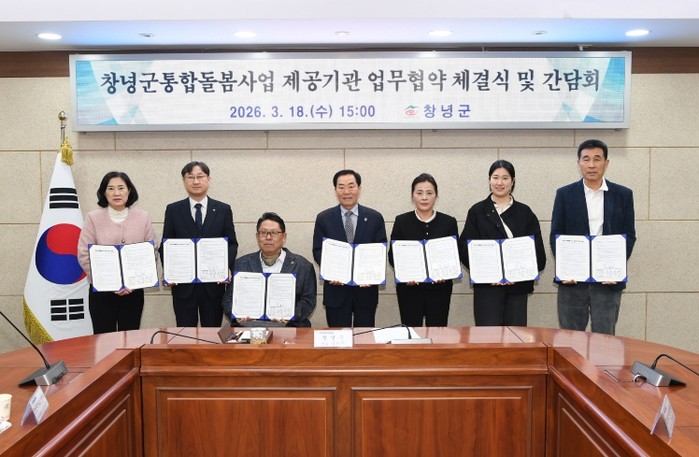 [파이낸셜경제=김예빈 기자] 창녕군은 18일 군정회의실에서 의료·요양 등 통합돌봄 서비스의 안정적 제공과 협력체계 구축을 위해 통합돌봄 제공기관 6개소 대표자가 참석한 가운데 업무협약을 체결하고 간담회를 개최했다.