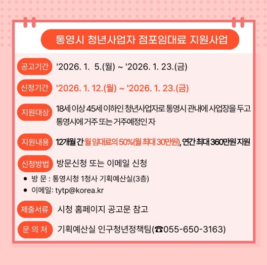 신청 대상은 통영시에 사업장을 두고, 통영시에 거주하거나 거주 예정(지원대상자 선정 시, 선정통보일로부터 20일 이내 통영시 전입)인 18세 이상 45세 이하의 청년 사업자이다.