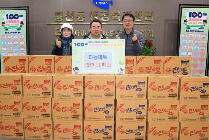 [파이낸셜경제=김기보 기자] 의정부시 흥선동행정복지센터는 12월 24일 다농마트가 ‘100일간 사랑릴레이 배턴 잇기’에 동참해 라면 50상자를 기탁했다고 밝혔다.