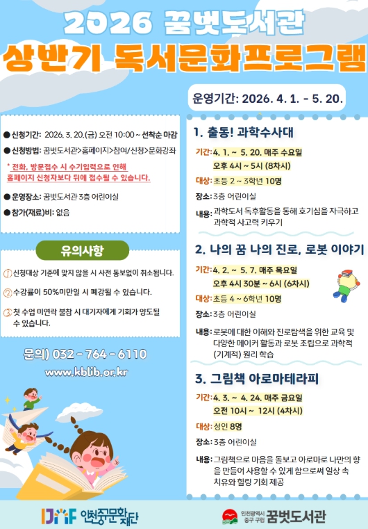 [파이낸셜경제=김기보 기자] (재)인천중구문화재단은 오는 4~5월 ‘구립 꿈벗도서관’에서 진행될 ‘2026 상반기 독서 문화프로그램’의 참여 수강생을 선착순 모집한다고 17일 밝혔다.
