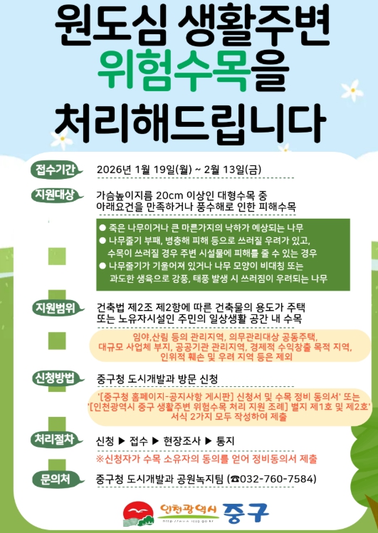 [파이낸셜경제=김기보 기자] 인천시 중구는 원도심 권역을 대상으로 ‘2026년도 원도심 생활 주변 위험 수목 처리지원 사업’을 추진한다고 21일 밝혔다.