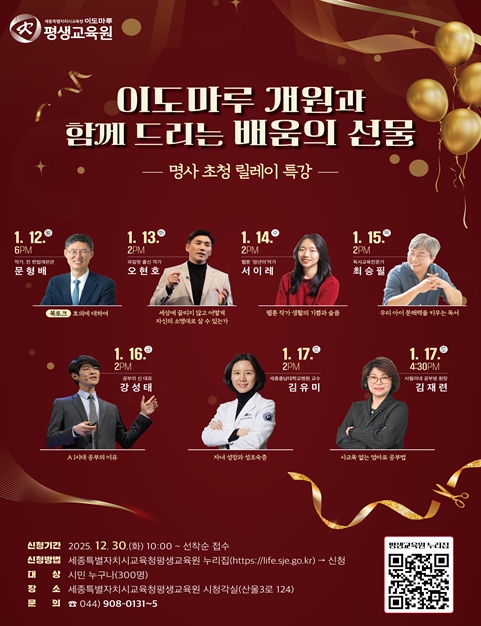 [파이낸셜경제=김영란 기자] 세종특별자치시교육청평생교육원(원장 송정순)은 2026년 1월 개원을 기념해 1월 12일부터 17일까지 6일간 개원 주간을 운영하고, 개원 행사의 일환으로 ‘명사 초청 릴레이 특강’을 매일 개최한다.