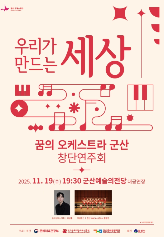 [파이낸셜경제=김예빈 기자] 군산문화관광재단은 19일 오후 7시 30분, 군산예술의전당 대공연장에서 '꿈의 오케스트라 군산 창단 연주회 ‘우리가 만드는 세상’'을 개최한다고 밝혔다.