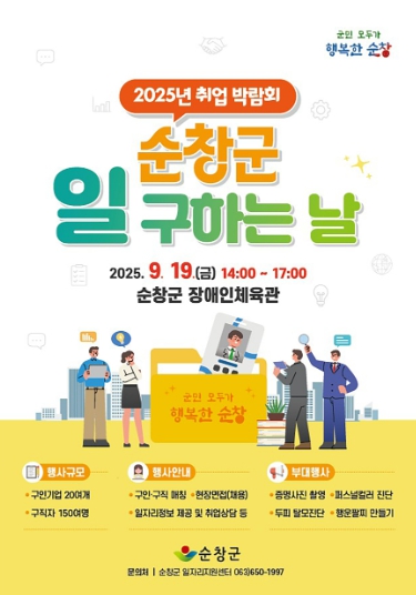 [파이낸셜경제=김예빈 기자] 순창군이 지역 일자리 창출과 구직자 취업 지원을 위해 오는 9월 19일(금) 오후 2시부터 5시까지 순창군장애인체육관에서 ‘2025년 취업 박람회–순창군 일 구하는 날’을 개최한다.