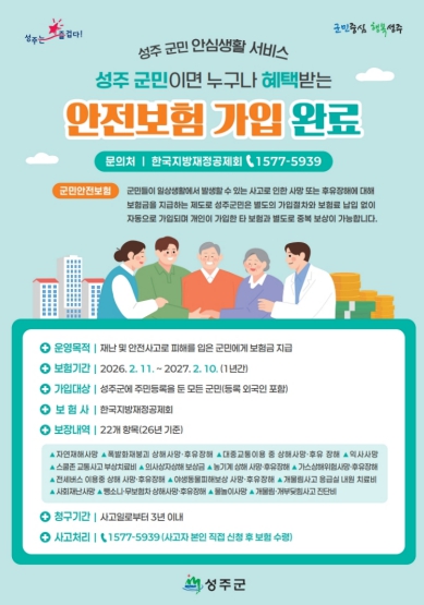 성주군 관계자는 “성주군 군민안전보험은 갑작스러운 재난이나 사고로 피해를 입은 모든 군민에게 혜택이 주어지는 안전복지제도”라며, “군민들의 안전한 일상생활에 실질적인 도움이 될 수 있도록 앞으로도 실효성 있게 운영하겠다.”고 밝혔다.