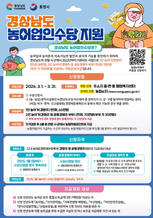 [파이낸셜경제=김예빈 기자] 통영시는 농어업의 공익적 기능 강화와 농어촌의 지속 가능한 발전을 위해 지급하는‘2026년 농어업인수당’을 다가오는 3월 1일부터 31일까지 한 달간 신청 받는다고 밝혔다.