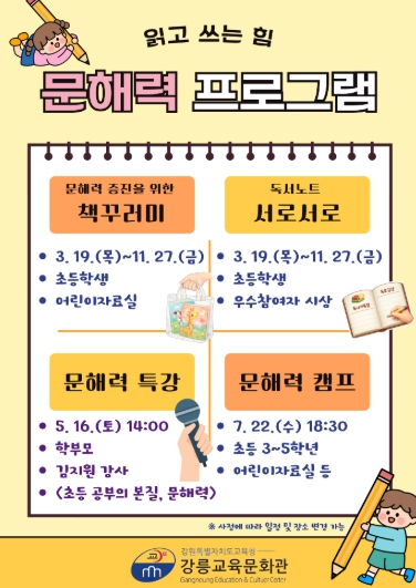 [파이낸셜경제=조성환 기자] 강릉교육문화관은 2026년 3월부터 기초 문해 역량을 체계적으로 강화하기 위한 ‘읽고 쓰는 힘, 문해력’ 프로그램을 운영한다.