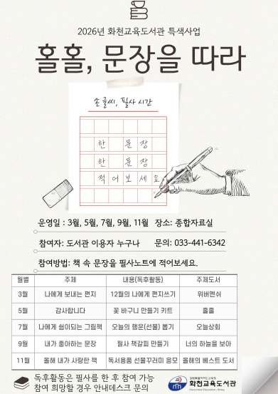 [파이낸셜경제=조성환 기자] 화천교육도서관은 오는 3월부터 11월까지 깊이 있는 독서문화의 확산을 위해 2026년 특색사업 ‘홀홀, 문장을 따라’를 운영한다.