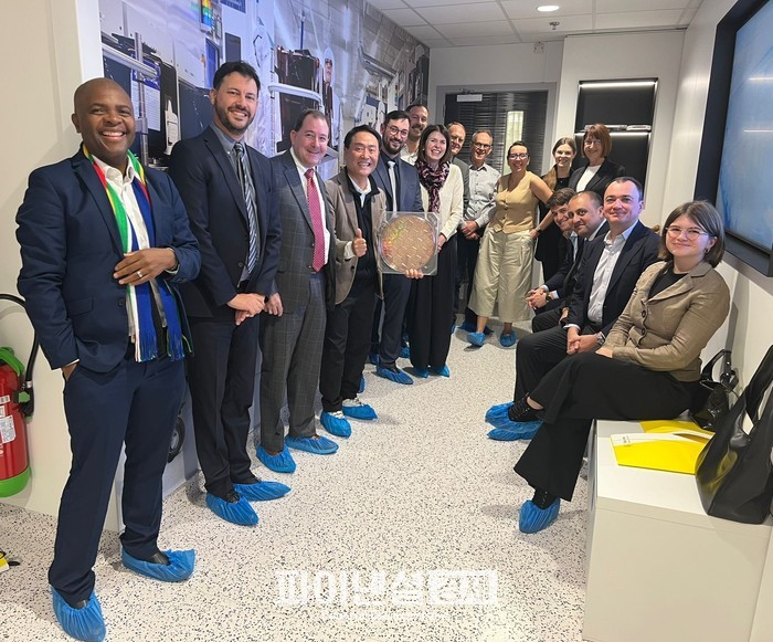| ▲사진3. IMEC 연구소, 세계 최대 반도체연구소 IMEC 클린룸에서 기념 촬영(가운데 웨이퍼를 들고 있는 강요식 교수) |