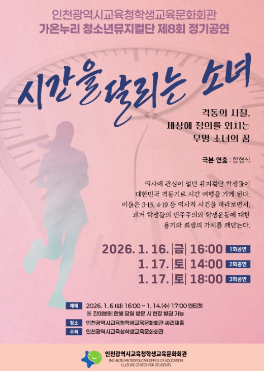 [파이낸셜경제=김기보 기자] 인천광역시교육청학생교육문화회관은 가온누리 청소년뮤지컬단 제8회 정기공연 ‘시간을 달리는 소녀’를 16일부터 17일까지 싸리재홀 대공연장에서 개최한다.