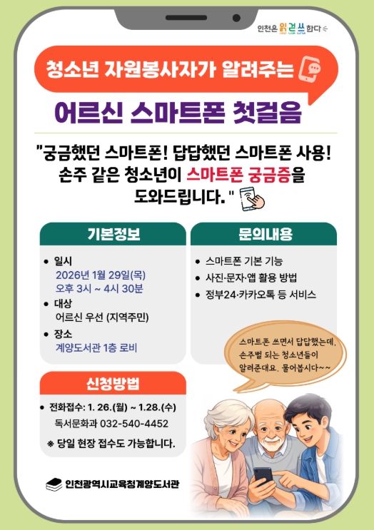 [파이낸셜경제=김기보 기자] 인천광역시교육청계양도서관은 오는 29일 1층 로비에서 ‘어르신 스마트폰 첫걸음’행사를 운영한다.