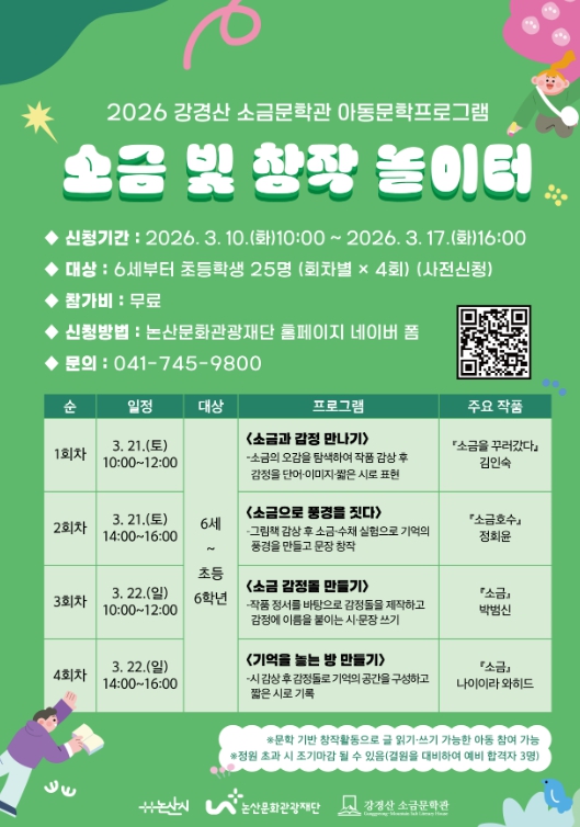 논산문화관광재단 지진호 대표이사는 “이번 프로그램을 통해 아이들이 문학을 보다 친근하게 접하고, 자신의 감정을 글로 자유롭게 표현하길 바라며, 소금문학관이 지역 아동문학 교육의 중심 공간으로 더욱 활성화되길 바란다”고 말했다.
