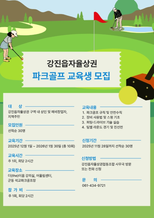 [파이낸셜경제=김예빈 기자] 강진읍 자율상권협동조합(이사장 김동수)이 상인들의 건강 증진과 상권 활성화를 위해‘파크골프 교육 프로그램’을 개설하고 오는 28일까지 교육생 30명을 선착순 모집한다.