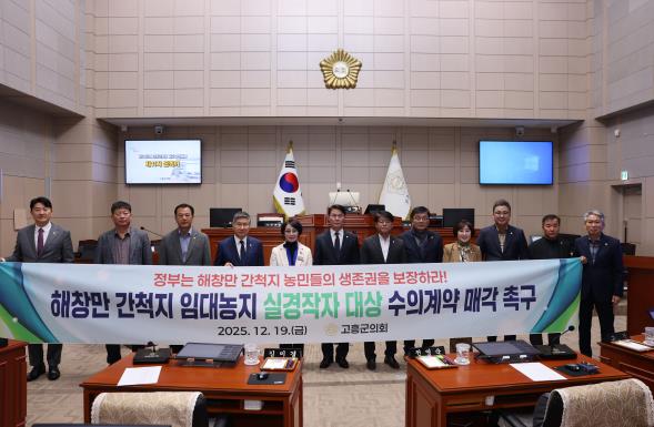 [파이낸셜경제=김예빈 기자] 고흥군의회는 12월 19일 열린 제342회 고흥군의회 제2차 정례회 제11차 본회의에서 '해창만 간척지 임대농지 실경작자 대상 수의계약 매각 촉구 건의안'을 의결하고, 해창만 간척지 임대농지를 실경작자에게 수의계약 방식으로 매각할 것을 정부와 관계 부처에 강력히 촉구했다.
