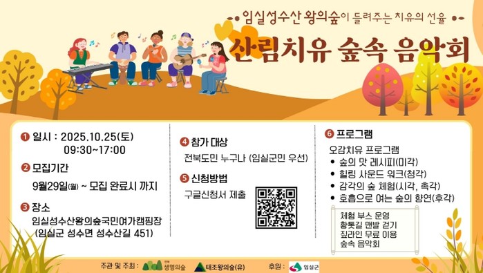 [파이낸셜경제=김예빈 기자] 임실군이 오는 25일 성수산 왕의숲 국민여가캠핑장 일원에서‘성수산 왕의숲 산림치유 숲속 음악회’를 개최한다.
