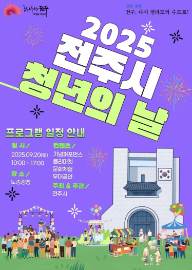 [파이낸셜경제=김예빈 기자] 전주시는 오는 20일 오전 10시부터 오후 5시까지 전주시청 앞 노송광장에서 청년과 시민이 함께 어우러지는 소통의 장인 ‘2025 전주시 청년의 날 행사’를 개최한다.
