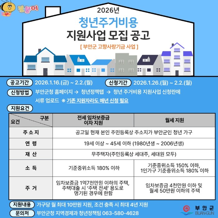 [파이낸셜경제=김예빈 기자] 부안군은 고향을 응원하는 소중한 마음이 담긴 고향사랑기부금을 활용해 관내 청년들의 주거 안정을 돕는 2026년 청년 주거비용 지원사업 신청자를 오는 26일부터 2월 2일까지 모집한다고 밝혔다.