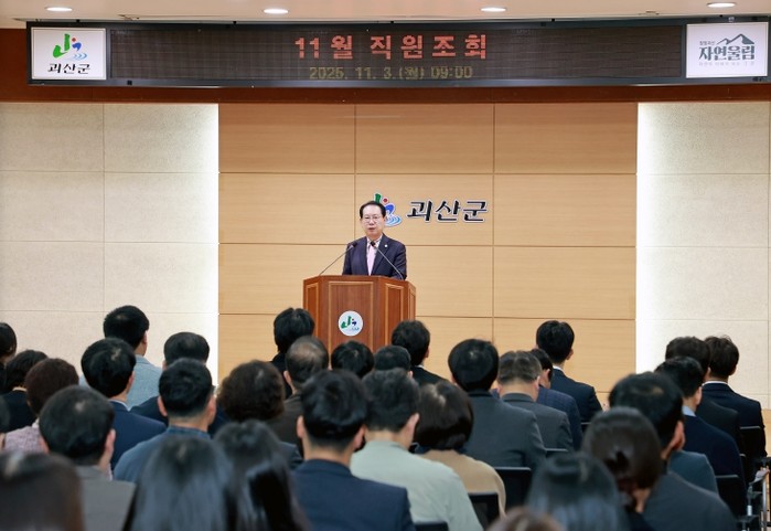 [파이낸셜경제=김기보 기자] 충북 괴산군은 3일 군청 대회의실에서 11월 직원조회를 열고, 올해 지역축제의 성과와 연말까지 중점 추진할 과제들을 공유했다.