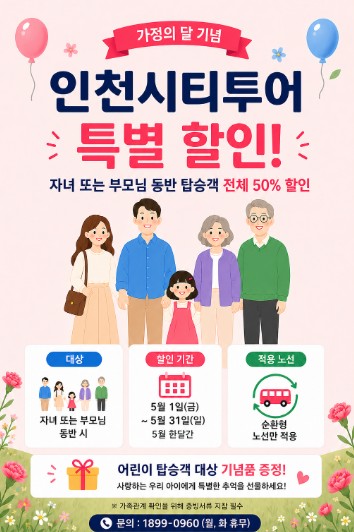 [파이낸셜경제=금윤지 기자] 인천관광공사는 5월 가정의 달을 맞아 가족 단위 관광객 유입을 확대하고 이용객의 재방문 활성화를 위한‘인천시티투어 특별 프로모션’을 실시한다고 밝혔다