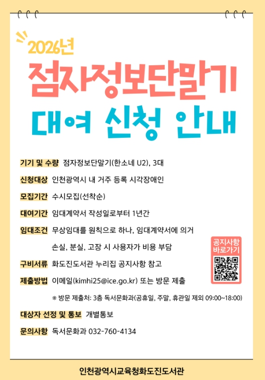 [파이낸셜경제=김기보 기자] 인천광역시교육청화도진도서관은 인천 거주 시각장애인을 대상으로 ‘점자정보단말기 무상대여 사업’을 운영한다고 9일 밝혔다.