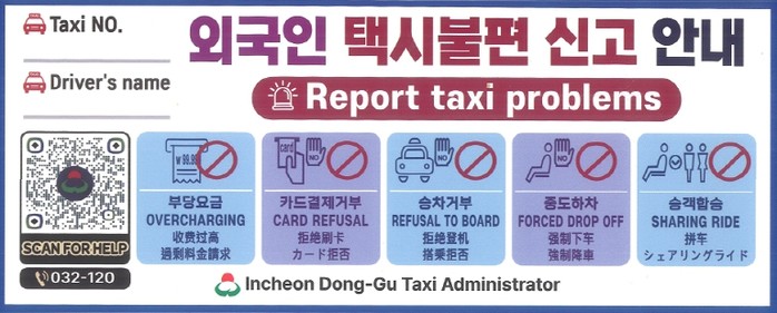 [파이낸셜경제=김기보 기자] 인천 동구는 외국인 관광객을 대상으로 한 불법 택시 영업을 근절하고 이용 편의를 높이기 위해‘불편 신고 QR스티커’를 택시에 부착한다고 밝혔다.