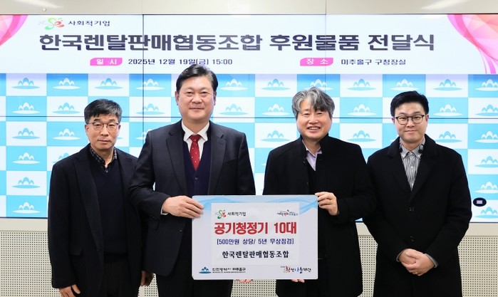 [파이낸셜경제=김기보 기자] 인천 미추홀구는 지난 19일 사회적기업 한국렌탈판매협동조합(대표 정영이)으로부터 공기청정기 10대를 전달받았다.