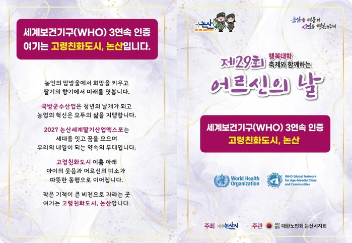논산시 관계자는 “올해 어르신의 날 행사는 고령친화도시 재인증 선포와 함께 더 의미 있는 행사가 될 것”이라며 “많은 어르신이 안전하고 행복한 시간을 보내실 수 있도록 행사 준비에 만전을 기하겠다”고 말했다.