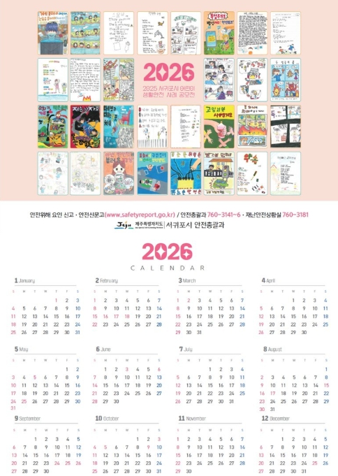 [파이낸셜경제=김영란 기자] 서귀포시는 지역사회에 생활 속 안전의식 확산을 위해 2025 어린이 생활안전사례 공모전 수상작 30작품을 활용한 안전문화달력 1,500부를 제작하여 전 부서와 학교, 유관기관에 배부했다고 밝혔다.