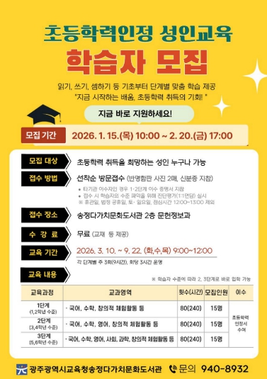 [파이낸셜경제=김예빈 기자] 광주시교육청송정다가치문화도서관은 ‘2026학년도 초등학력인정 성인교육’ 프로그램을 운영한다.