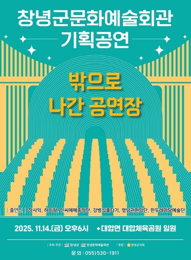 [파이낸셜경제=김예빈 기자] 창녕군은 오는 14일 오후 6시부터 7시 30분까지 특별 기획 공연‘밖으로 나간 공연장’을 대합면 체육공원 일원에서 개최한다.