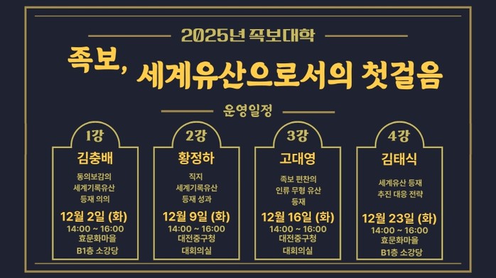[파이낸셜경제=김영란 기자] 대전 중구는 오는 12월 2일부터 23일까지 매주 화요일, 총 4회에 걸쳐 2025 족보대학 ‘족보, 세계유산으로서의 첫 걸음’프로그램을 운영한다고 밝혔다.