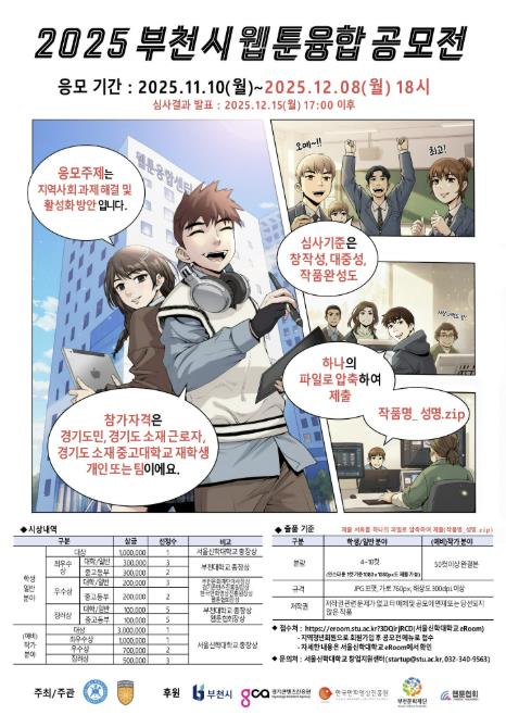 [파이낸셜경제=김기보 기자] 부천시는 11월 10일부터 12월 8일까지 서울신학대학교 ‘이룸(eRoom)’ 플랫폼을 통해 지역 웹툰 창작 생태계를 조성하고 차세대 창의인재를 발굴하기 위한 ‘2025 부천시 웹툰융합공모전’을 개최한다.