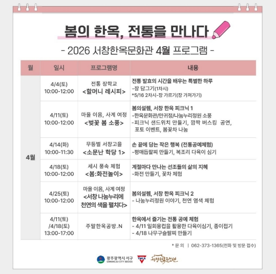 [파이낸셜경제=김예빈 기자] 광주광역시 서구가 도심 속 한옥에서 봄의 정취와 전통문화를 한자리에서 즐길 수 있는 특별한 경험을 선사한다. 서구는 4월 한 달간 서창한옥문화관에서 ‘봄의 한옥, 전통을 만나다’를 주제로 전통문화 프로그램을 운영한다.