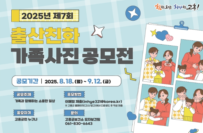 [파이낸셜경제=김예빈 기자] 고흥군은 결혼과 출산에 대한 긍정적인 인식을 확산하고 가족 친화적인 사회 분위기 조성을 위해 올해 일곱 번째로 ‘출산 친화 가족사진 공모전’을 개최한다고 밝혔다.