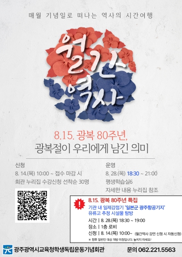 [파이낸셜경제=김예빈 기자] 광주광역시교육청학생독립운동회관은 14일부터 28일까지 ‘월간역사’ 특강 수강생을 모집한다.