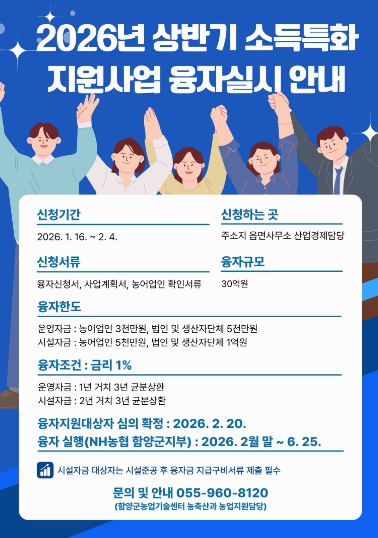 [파이낸셜경제=김예빈 기자] 함양군은 농업인의 경영개선과 농업 경쟁력 강화를 위한 ‘2026년 상반기 소득특화지원사업’을 시행하고, 오는 2월 4일까지 융자신청을 받는다.