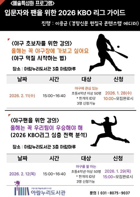 [파이낸셜경제=김기보 기자] 고양특례시 아람누리도서관은 오는 2월 11일과 12일 오후 3시부터 4시 40분까지 예술특성화 프로그램‘입문자와 팬을 위한 2026 KBO 리그 가이드’를 운영한다.