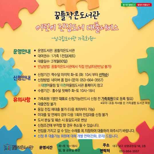 [파이낸셜경제=김지훈 기자] 대구 남구는 오는 2월 24일 화요일 10시부터 꿈틀작은도서관에서‘전집대출’ 서비스를 운영한다고 밝혔다.