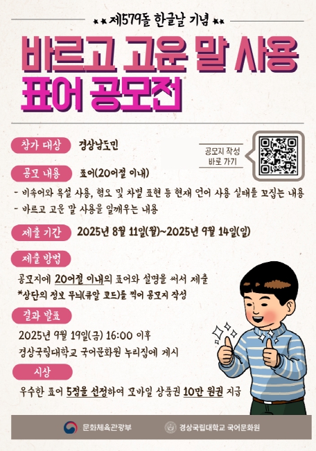 [파이낸셜경제=김예빈 기자] 경상국립대학교 국어문화원은 제579돌 한글날(10월 9일)을 맞이해 ‘바르고 고운 말 사용 표어 공모전’을 개최한다.