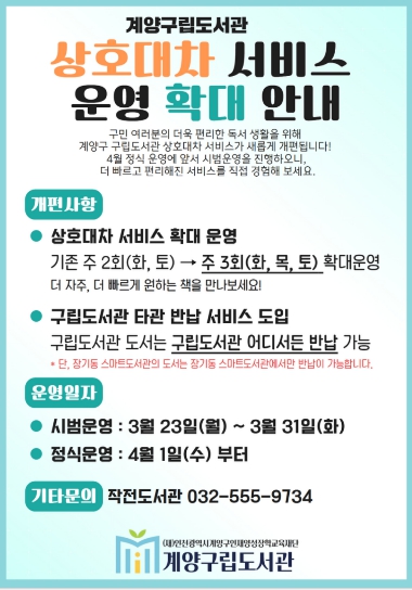 [파이낸셜경제=김기보 기자] (재)인천광역시계양구인재양성장학교육재단 계양구립도서관은 오는 4월 1일부터 상호대차 서비스 운영을 확대하고, 타관 반납 서비스를 새롭게 도입한다.