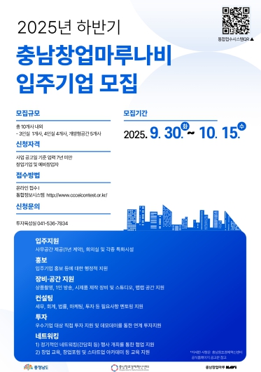 [파이낸셜경제=김영란 기자] (재)충남창조경제혁신센터는 오는 10월 15일까지 2025년 하반기 충남창업마루나비 입주기업을 모집한다고 밝혔다. 이번 모집은 혁신적인 아이디어와 성장 잠재력을 지닌 스타트업을 발굴해 안정적인 보육 환경을 제공하고, 기업의 지속적인 성장을 지원하기 위해 추진된다.